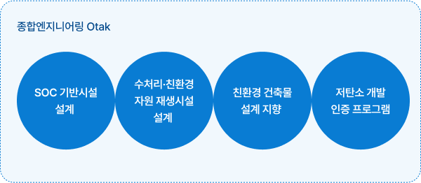 Otak은 2011년부터 환경 및 지속가능성에 대한 이니셔티브 도입을 위해 Green Otak(GO) 위원 회를 결성하여 Training, Operation, Practice 3가지 부문에서 회사와 프로젝트의 환경적 영향을 지속적으로 개선하고 있습니다. LEED Platinum 인증과 같은 저탄소 개발 인증 프로그램을 적용하는 등의 지속가능한 프로젝트와 친환경 건축물 설계를 지향합니다. 2011년 AIA 2030 챌린지에 가입하여 2030년까지 에너지 사용 집약도(EUI) 100% 감축 설계를 목표로 두고 있습니다.
